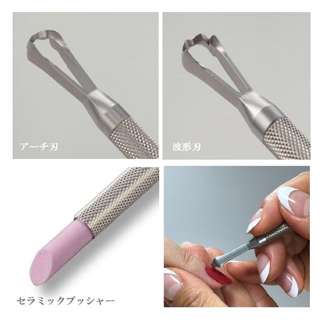 使用方法はアセトンで柔らかくなったジェルに波形刃で複数スジを入れ、アーチ刃でならしていきます。この時鉛筆を持つ様な立てた角度で爪に当てるとエッジが効いて落としやすくなります。
